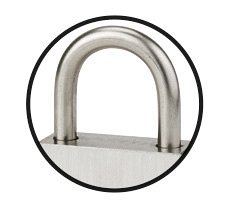 Lucchetto in acciaio inox. Ansa in acciaio inox. Meccanismo di blocco del pin. Doppio bloccaggio con sfere in acciaio inox. Chiave prigioniera: il lucchetto deve essere chiuso per riprendere la chiave. 2 chiavi piatte reversibili in ottone nichelato con scheda di proprietà, che consentono la riproduzione delle chiavi esclusivamente al proprietario. Possibilità di chiave unica e a organigramma